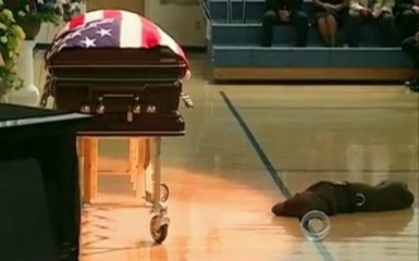 Among those who attended the funeral of Navy SEAL Jon Tumilson of Iowa was his dog, Hawkeye, who laid quietly at foot of the casket for the service. (Tumilson was stationed in San Diego.)