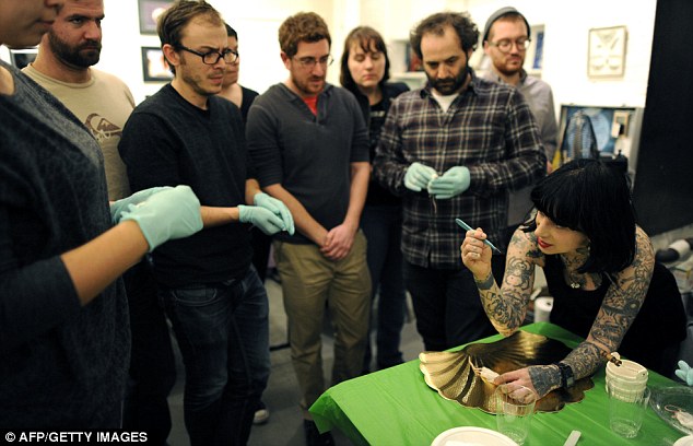 An educator and tattoo artist, [Sue Jeiven] begins the four-hour lesson handing out the lifeless little creatures, having sucked out their blood with a syringe beforehand. A statement on the class website warns only feeder mice are used for the arts and crafts session.